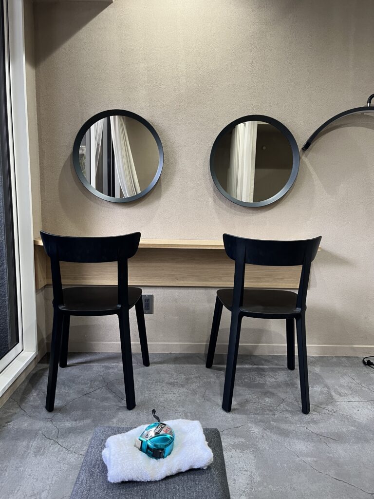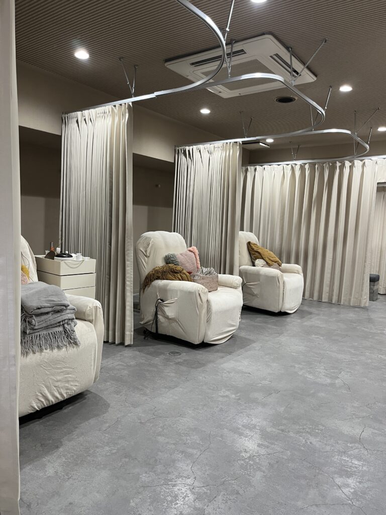 カーテンで仕切られた空間に既存のリクライニング椅子が綺麗に納まり竣工です。